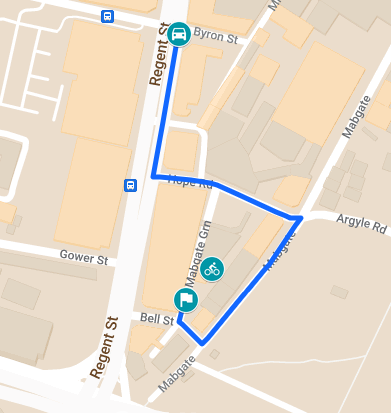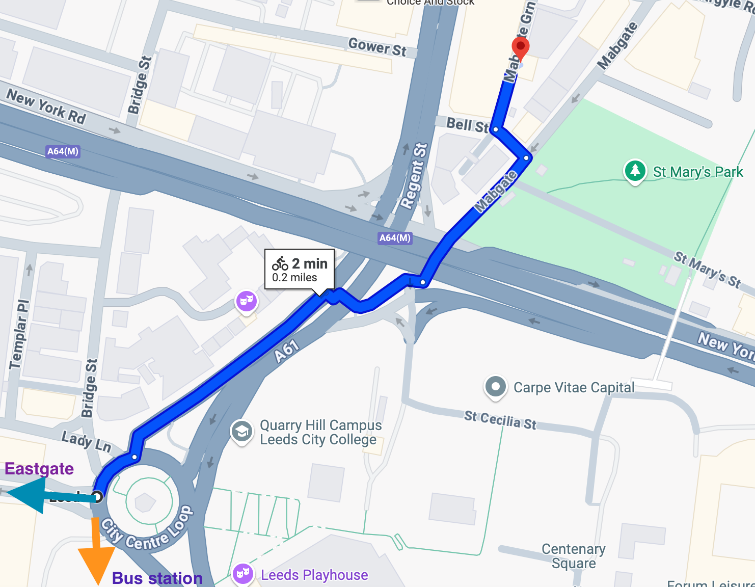 You may find apps such as CycleStreets helpful to plan your route. As with vehicles, most routes approach us via Regent Street. If you’re approaching by bike from the city centre, at the Eastgate Roundabout take the Regent Street exit onto the segregated cycle path, going past the old “Opportunity Centre” on your left, cross over at the pedestrian/cycle crossing soon after, then bear left and go under the New York Road bridge. You will join onto a short section of cycle lane, cross over again gets you onto Mabgate. Then take the first left (Bell Street) then right onto Mabgate Green (map image below).
