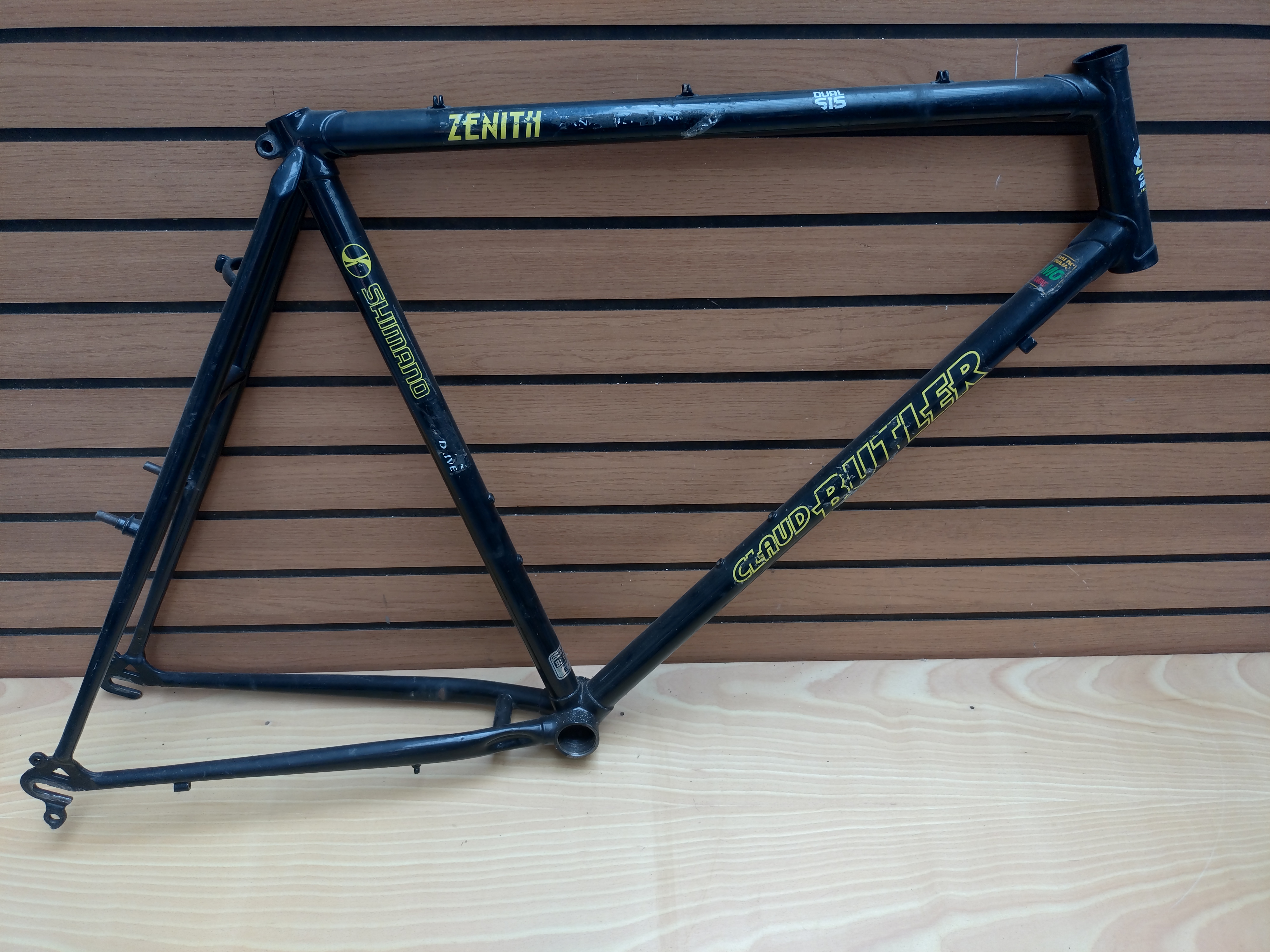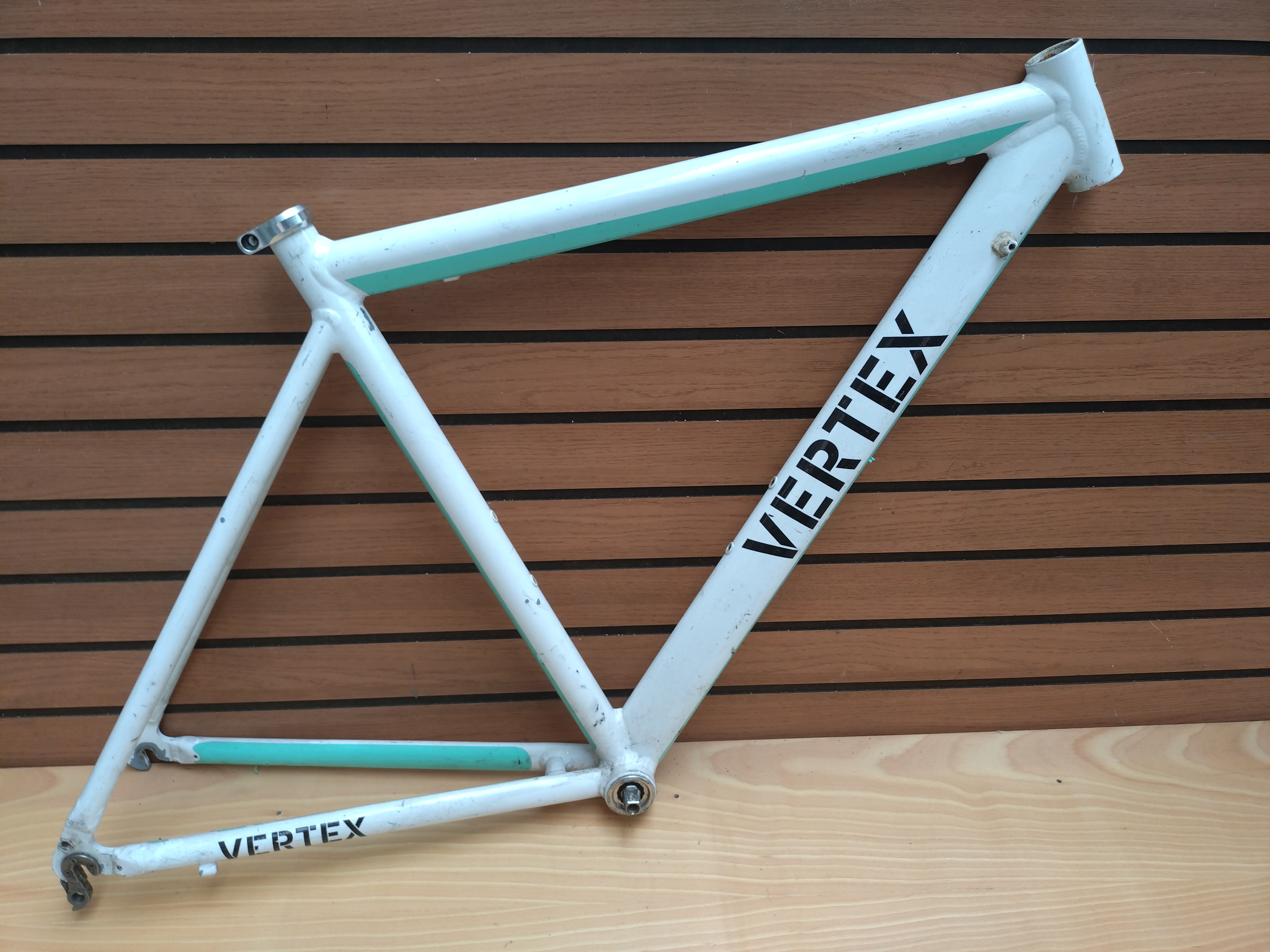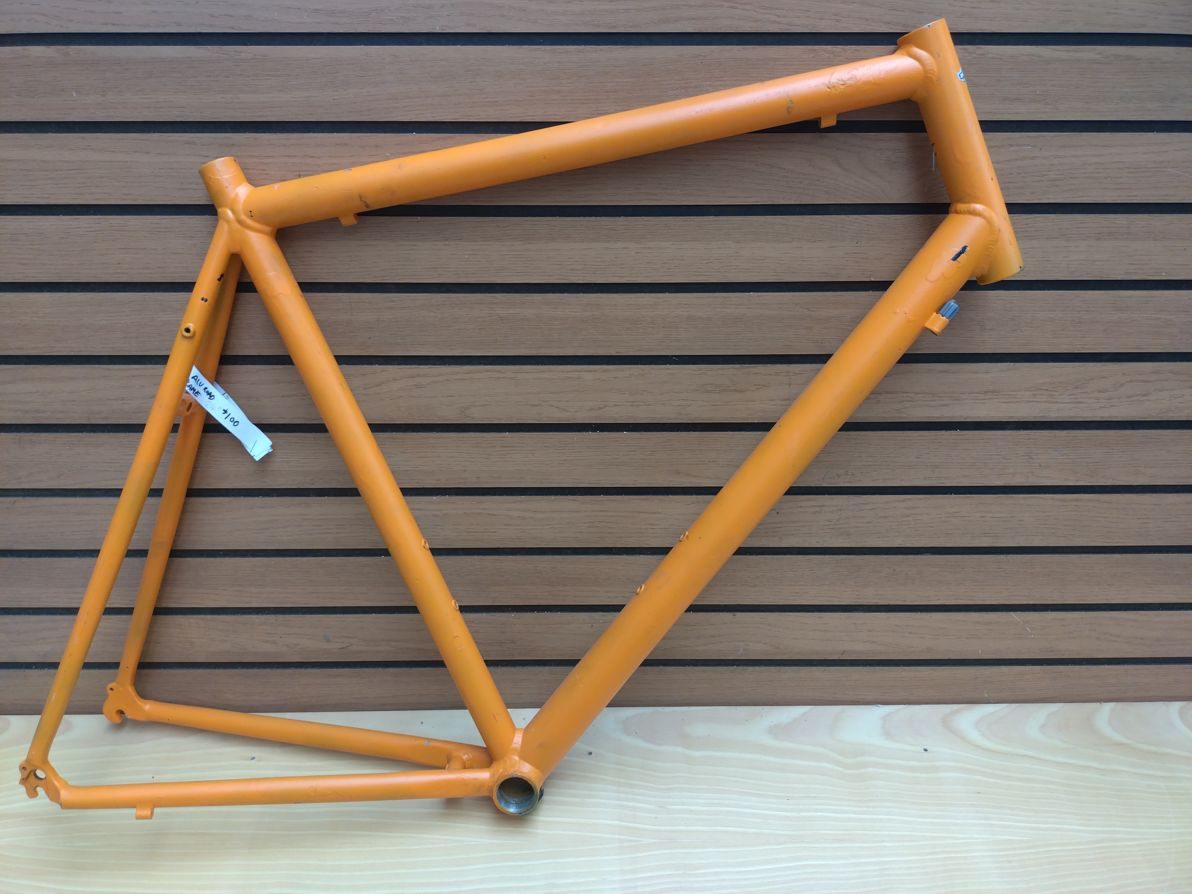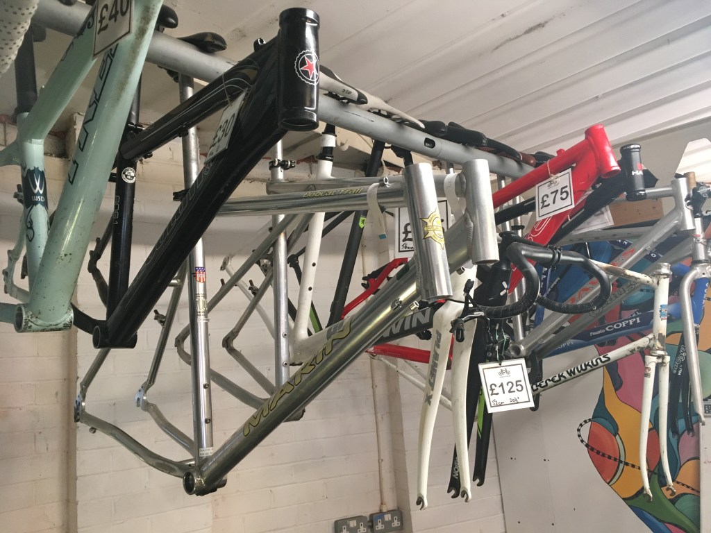 Typically sold from £10 and up. If you see a frame you are interested in, get in touch and make us an offer. See below for a sample of the frames we have in the workshop at the moment, click on an image to see the frame size (measured from centre of bottom bracket to top of seat tube) and frame material.